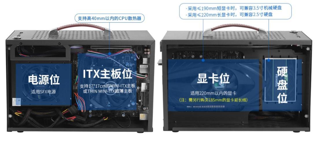 1、itx手提式小機箱的體型帶來了相應的空間組裝電源線、主板芯片顯卡、硬盤等硬件配置,同時通過機箱內的托架將各種硬件配置固定機箱內,構成一個相對獨立的體系結構。